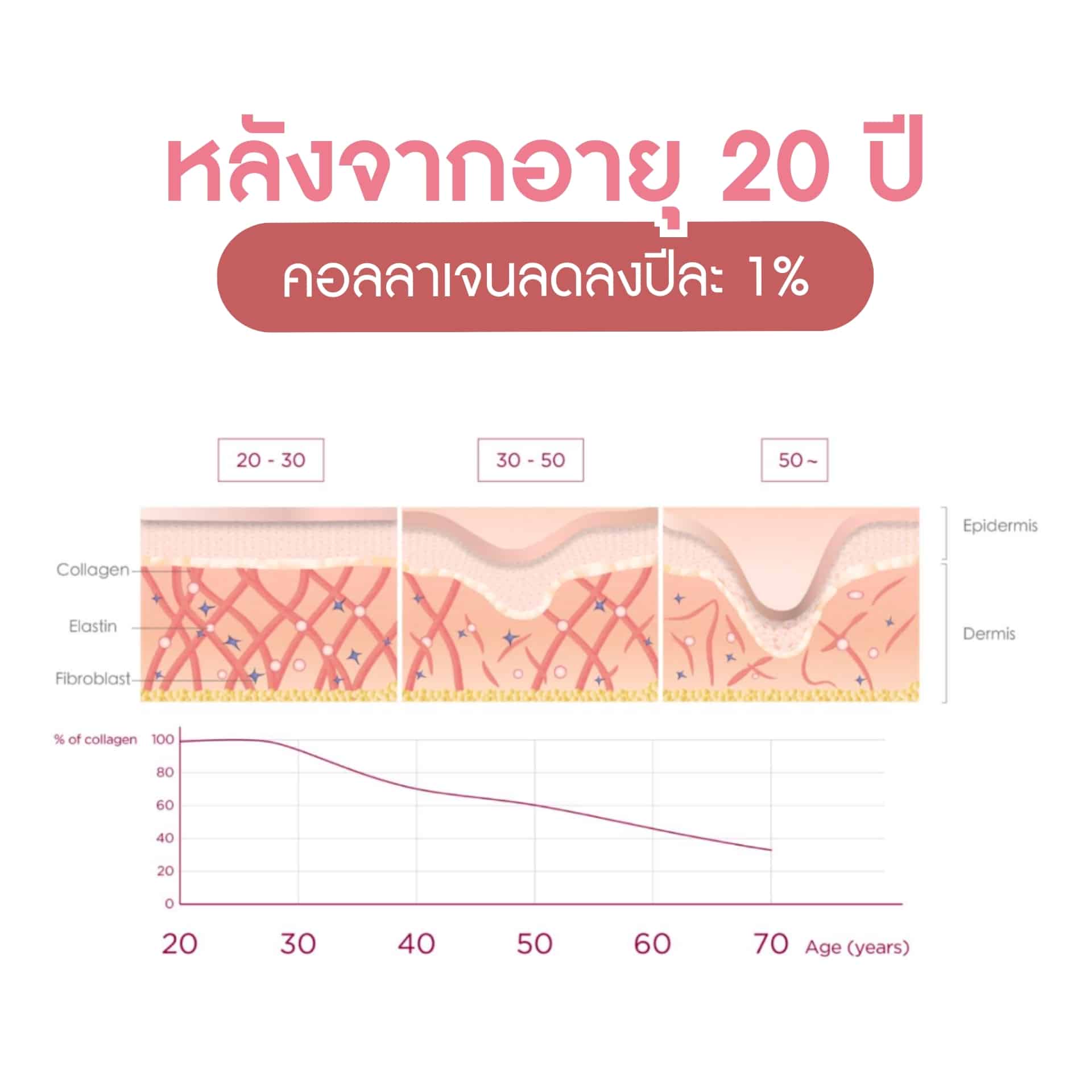 - คอลลาเจนจะลดลงปีละ 1% เมื่อเข้าสู่ช่วงอายุ 20 ปีขึ้นไป และการสร้างคอลลาเจนลดลงอย่างมีนัยสำคัญเมื่ออายุ 45 ปี