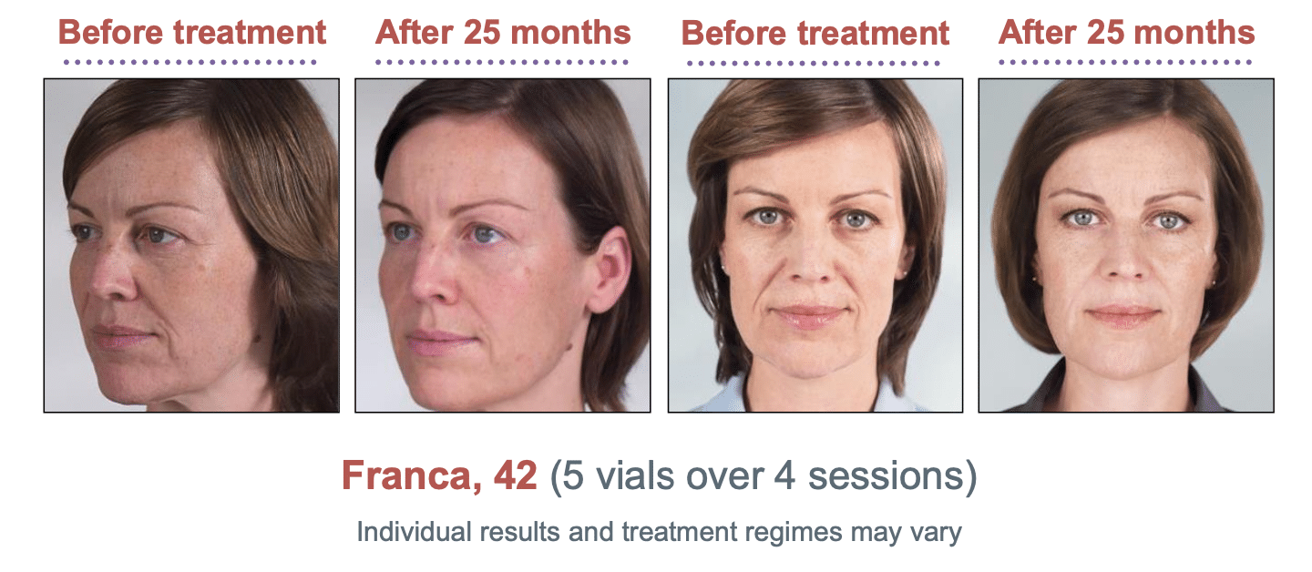 แนะนำให้ฉีด 2-4 cc จำนวน 3 ครั้งขึ้นไปห่างกัน 2-3 สัปดาห์จะทำให้เห็นผลชัดเจน ผิวแข็งแรง เรียบเนียน สีผิวสม่ำเสมอ รูขุมขนกระชับ แลดูอ่อนเยาว์และสุขภาพดี ซึ่งจะสามารถคงผลลัพธ์ได้นาน 6-12 เดือน