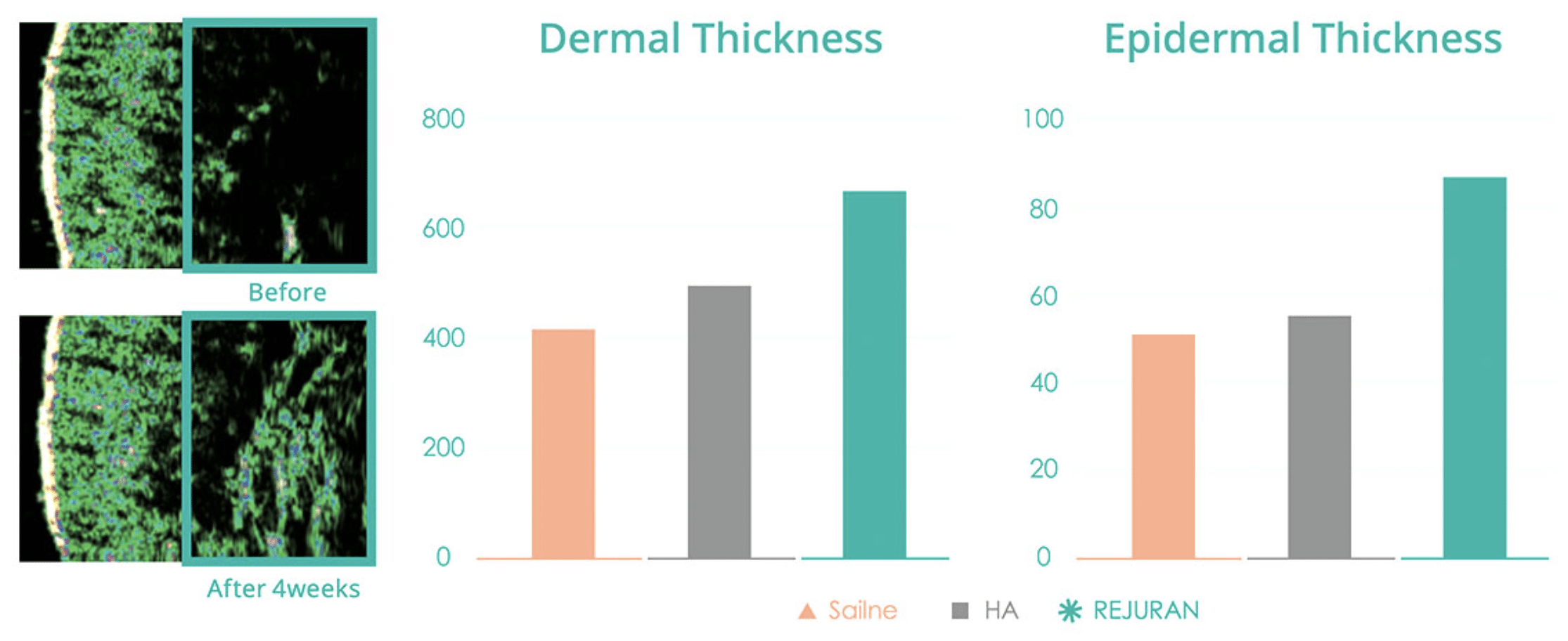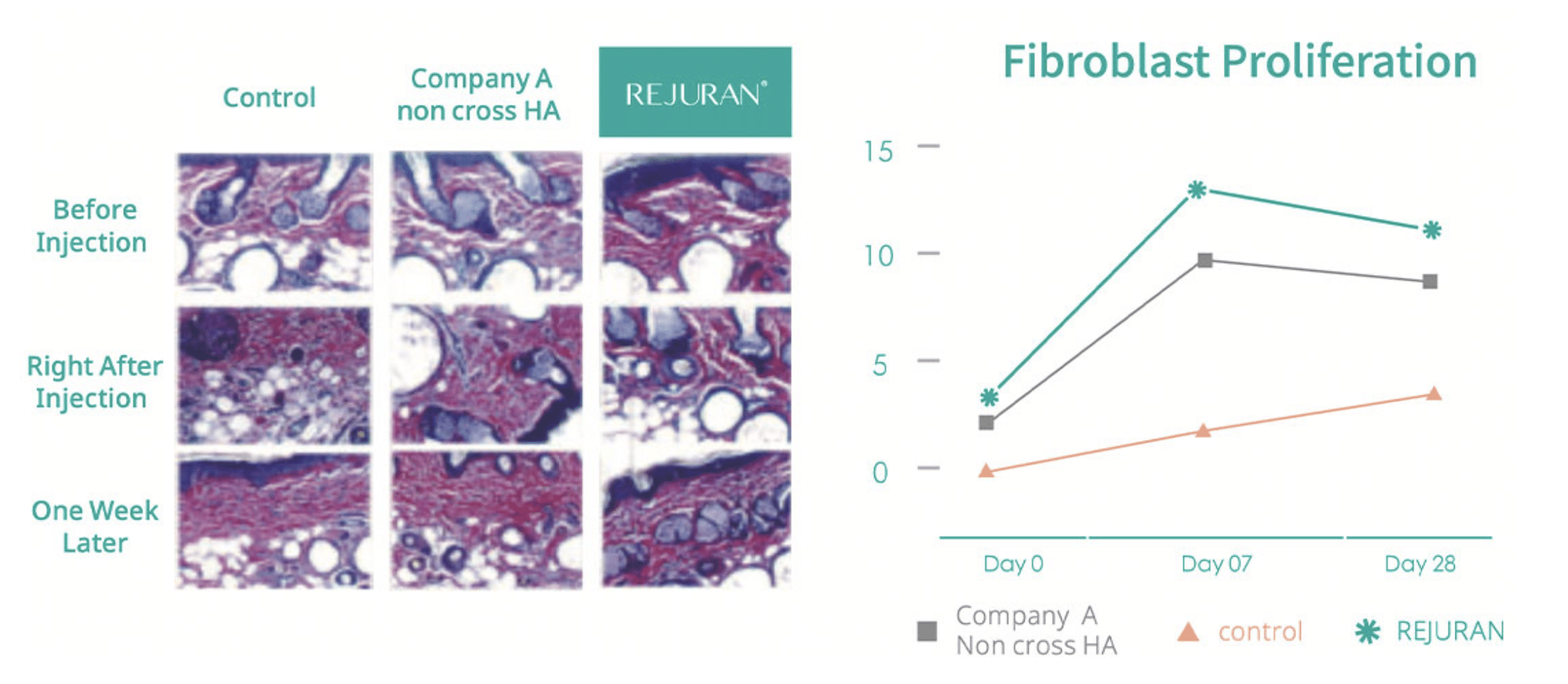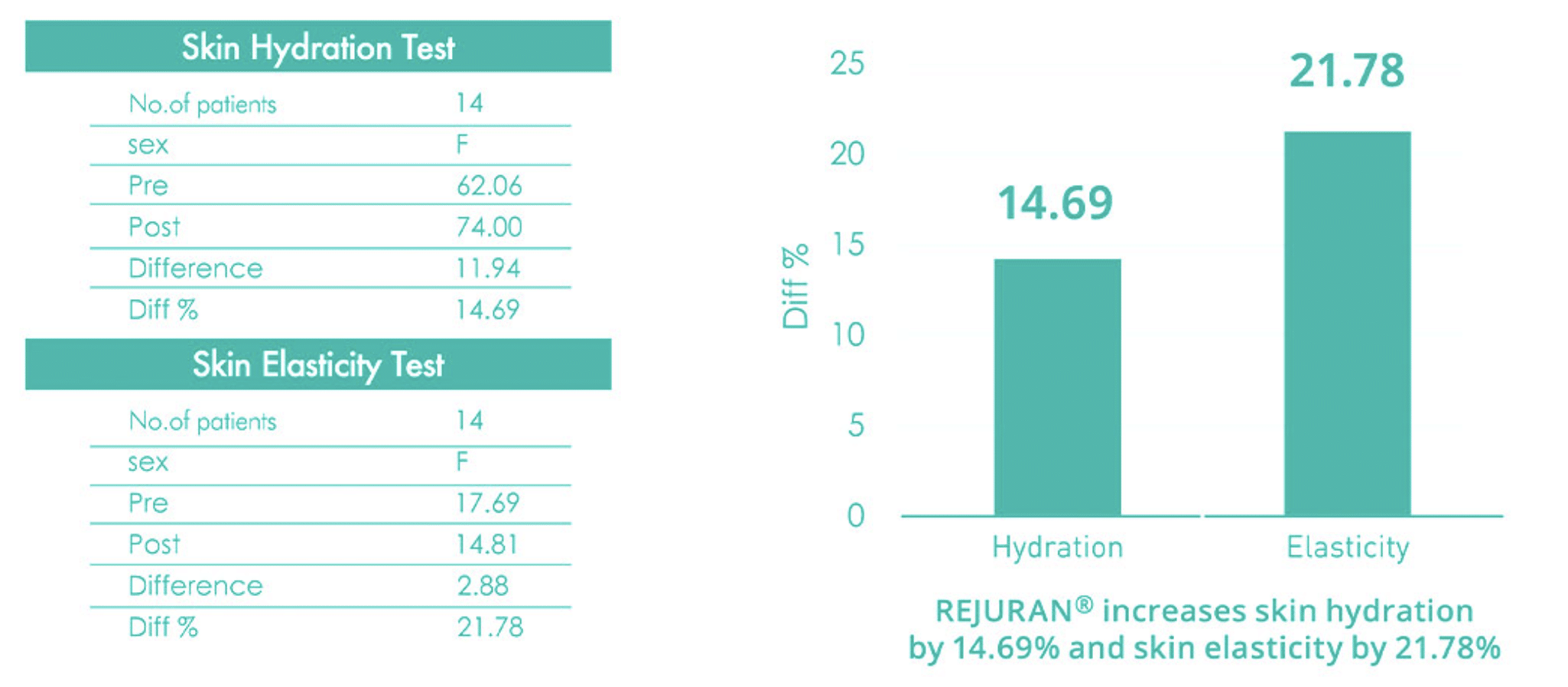 Rejuran มีส่วนประกอบหลักเป็น Polynucleotide สกัดจากปลาแซลม่อนในทะเลธรรมชาติ ซึ่งช่วยให้ร่างกายสร้างเซลล์ไฟโบรบลาสต์ เกิดการกระตุ้นให้สร้างคอลลาเจนมากยิ่งขึ้น อีกทั้งช่วยผิวชุ่มชื้นให้กับผิว นอกจากนี้ Rejuran ยังช่วยเพิ่มความยืดหยุ่นและเพิ่มความหนาแน่นแก่ผิว รวมๆแล้ว Rejuran ช่วยฟื้นฟูผิว ทำให้ผิวกระชับ อิ่มฟู มีความกระจ่างใสมากยิ่งขึ้น และยังเพิ่มความยืดหยุ่น ให้ผิวแข็งแรง ดูสุขภาพดีขึ้นอีกด้วยค่ะ